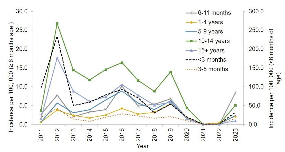 图3 2011年至2023年英格兰实验室确诊百日咳病例按年龄组划分的年发病率