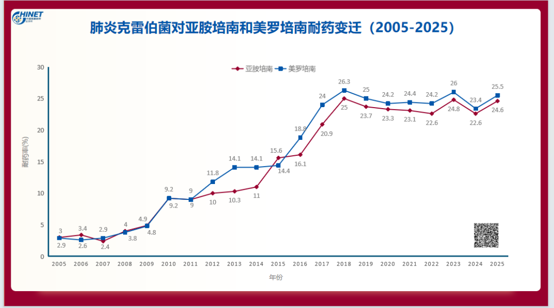 图1:CHINET主动监测数据:肺炎克雷伯菌对亚胺培南和美罗培南耐药变迁(2005-2025)
