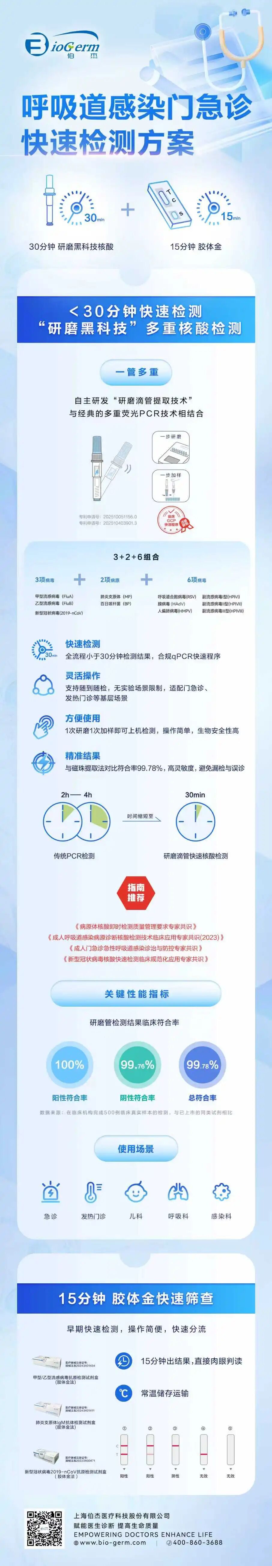 伯杰医疗门急诊核酸快速检测方案,采用先进的荧光定量PCR技术,具有灵敏度高、特异性强、操作简便等优点。可提供甲乙流、肺支、百日咳;以及呼吸道常见病毒的呼吸道病毒六项检测试剂盒,在检测偏肺病毒、合胞病毒同时包含腺病毒(HAdV)、副流感病毒(PIVⅠ、Ⅱ、Ⅲ型),覆盖CDC监测的重要致病原。搭配近期新推出的研磨管黑科技,30分钟出结果,助力门急诊快速早筛方案,有研究显示:使用快速多重PCR精准诊断可减少住院时间0.82天。此外,另有甲型/乙型流感病毒抗原检测试剂盒(胶体金法)操作简便快捷,仅需1分钟即可完成检测,15分钟内提供结果。成为门、急诊病原体筛查的得力助手,帮助医疗机构更高效地分流患者,显著提升整体诊疗效率与服务质量。