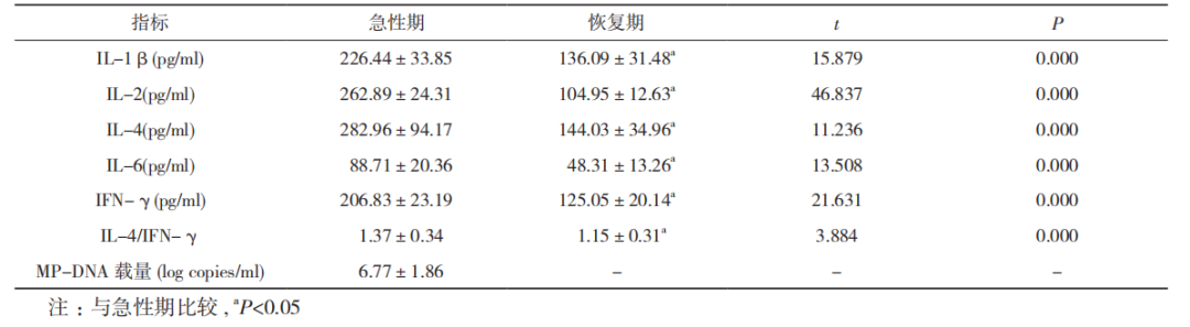 SMPP组患儿急性期与恢复期炎症细胞因子水平比较,SMPP组患儿恢复期 IL-1β、IL-2、IL-4、IL-6、IFN-γ 和 IL-4/IFN-γ 均明显低于急性期, 差异具有统计学意义 (P<0.05)。(表2)这表明细胞因子表达情况与病情转归等均有一定关系 , 因此细胞因子检测可为临床评估病情和治疗干预提供了一定的理论依据。