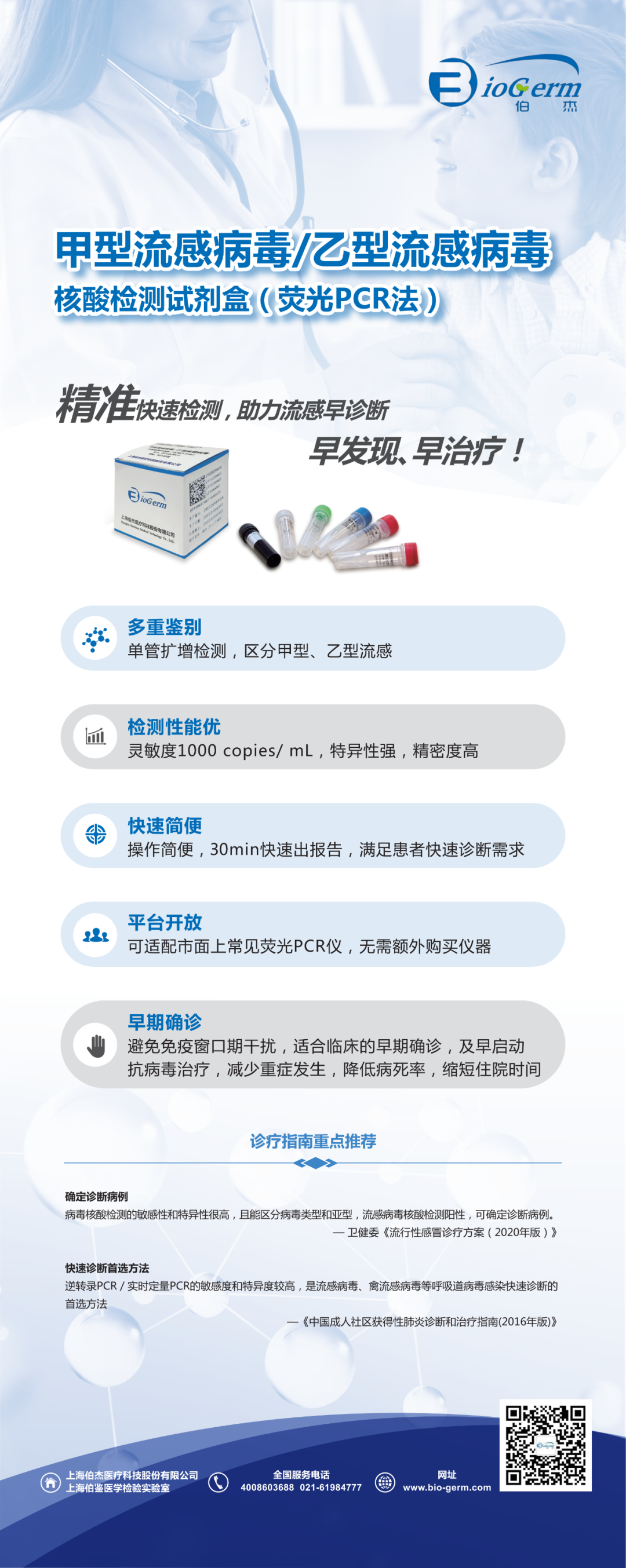 伯杰已推出甲型流感病毒/乙型流感病毒核酸检测试剂盒(荧光PCR法),具有快速准确的检测能力,仅需30分钟即可完成,极大地满足了门急诊及住院患者对于迅速诊断的需求,为早期发现、及时干预提供了强有力的支持。此外,伯杰另有甲型/乙型流感病毒抗原检测试剂盒(胶体金法)。操作简便快捷,1分钟检测,15分钟出结果,成为发热门诊最得力的病原体筛查工具。可帮助医疗机构更有效地分流病人,从而显著提升整体诊疗效率与服务质量。
