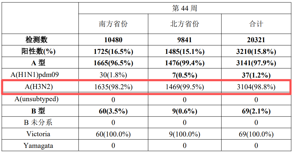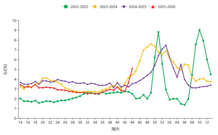 2025年第44周,全国(未含港澳台地区,下同)流感监测网络实验室共检测流感样病例监测标本20321份。北方省份哨点医院报告的流感样病例( Influenza-like illness, ILI)为 5.1%,较上周升高3.7%,高于2022年,2023年和2024 年同期水平(2.5%,4.4%和 3.5%)。检测到流感病毒阳性标本1485份,其中7份A(H1N1)pdm09,1469份为A(H3N2)占比99.5%,南方省份哨点医院报告的ILI%为4.6%,高于前一周水平(4.1%),高于 2022 年和 2024 年同期水平(3.1%和 3.3%),其中A(H3N2)占比98.2%,全国H3N2占比为98.8%[2]。