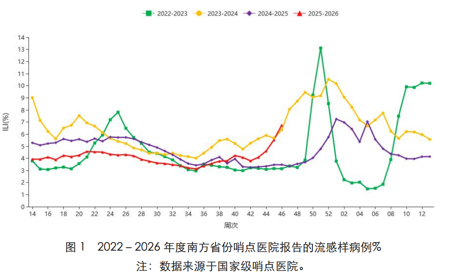根据中国疾控中心最新发布流感监测周报数据,2025 年第 46 周(2025 年 11 月 10 日-2025 年 11 月 16 日),南北方省份哨点医院报告的ILI%继续上升,均高于过去3年同期水平。