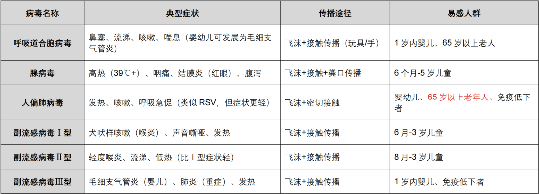 不同病毒感染的症状虽有相似之处(均以发热和呼吸道症状为主),但也存在细微区别:流感的典型表现是高热不退+肌肉关节酸痛;鼻病毒以上呼吸道不适为主,肌肉酸痛不明显;呼吸道合胞病毒更“青睐”低龄婴幼儿,可能伴随喘息症状。