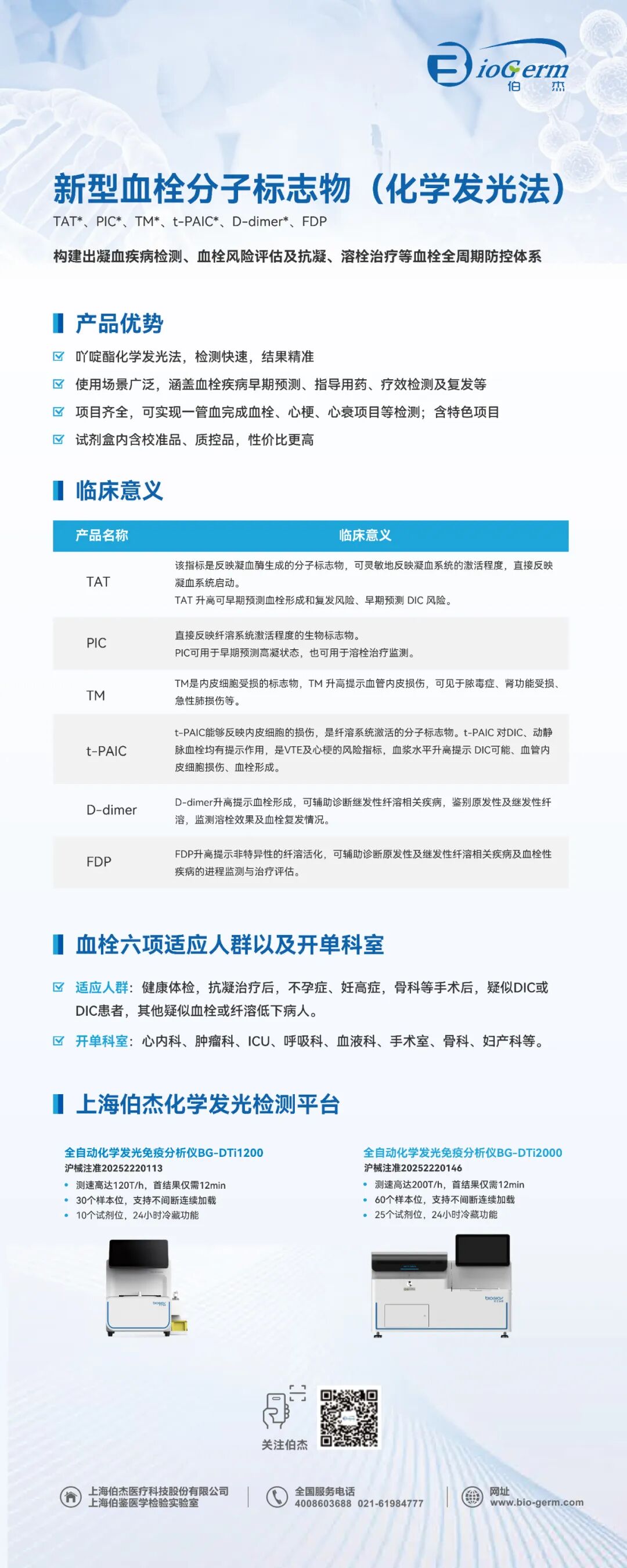 适应人群:健康体检,抗凝治疗后,不孕症、妊高症,骨科等手术后,疑似DIC或DIC患者,其他疑似血栓或纤溶低下病人。