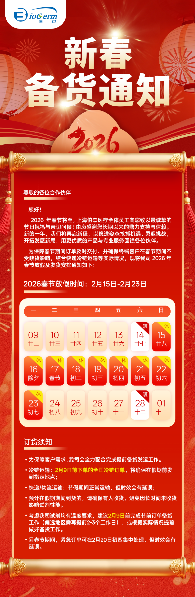 一键查阅 | 伯杰医疗2026年春节备货通知