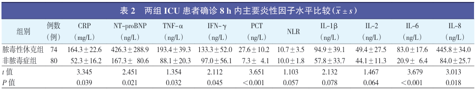 在脓毒症早期,机体产生促炎因子后,抗炎因子反馈生成,两者相互调节, 可改善炎症反应强度。研究显示,脓毒性休克组 CRP、NT-proBNP、TNF-α、IFN-γ、PCT、IL-6、IL-8 水平较非脓毒症组显著升高(均P<0.05),并且多因素Logistic回归分析结果显示,CRP、NT-proBNP、TNF-α、PCT、IL-6 是发生脓毒性休克的独立危险因素(均P<0.05)。
