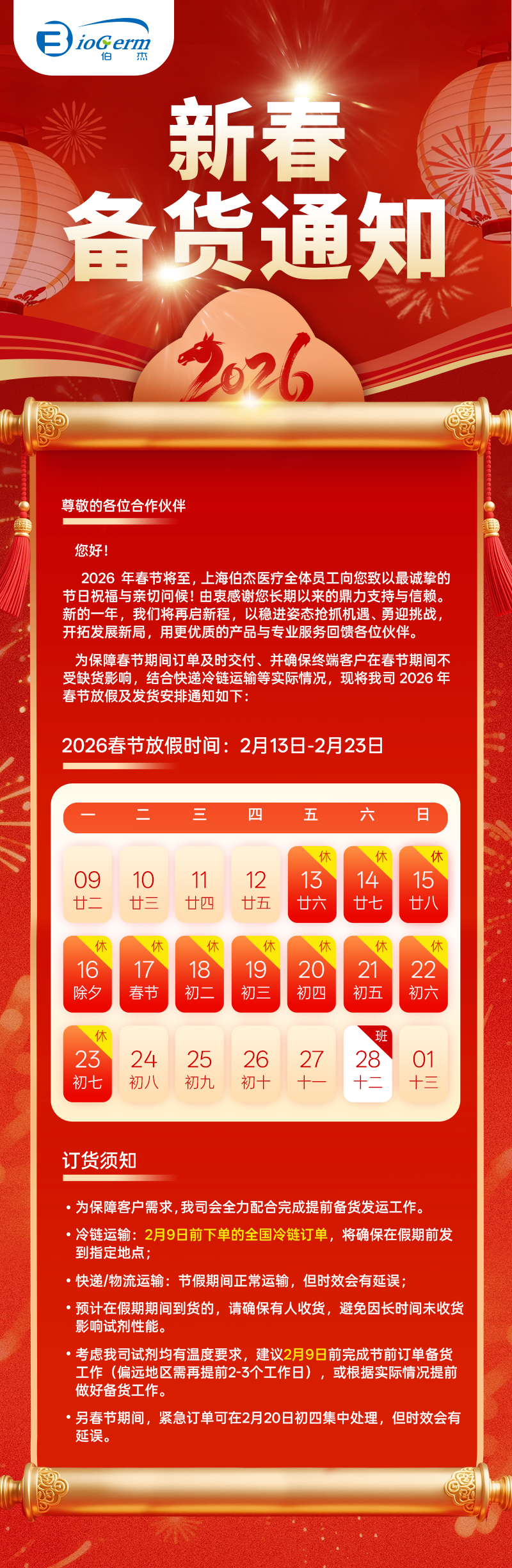 一键查阅 | 伯杰医疗2026年春节备货通知