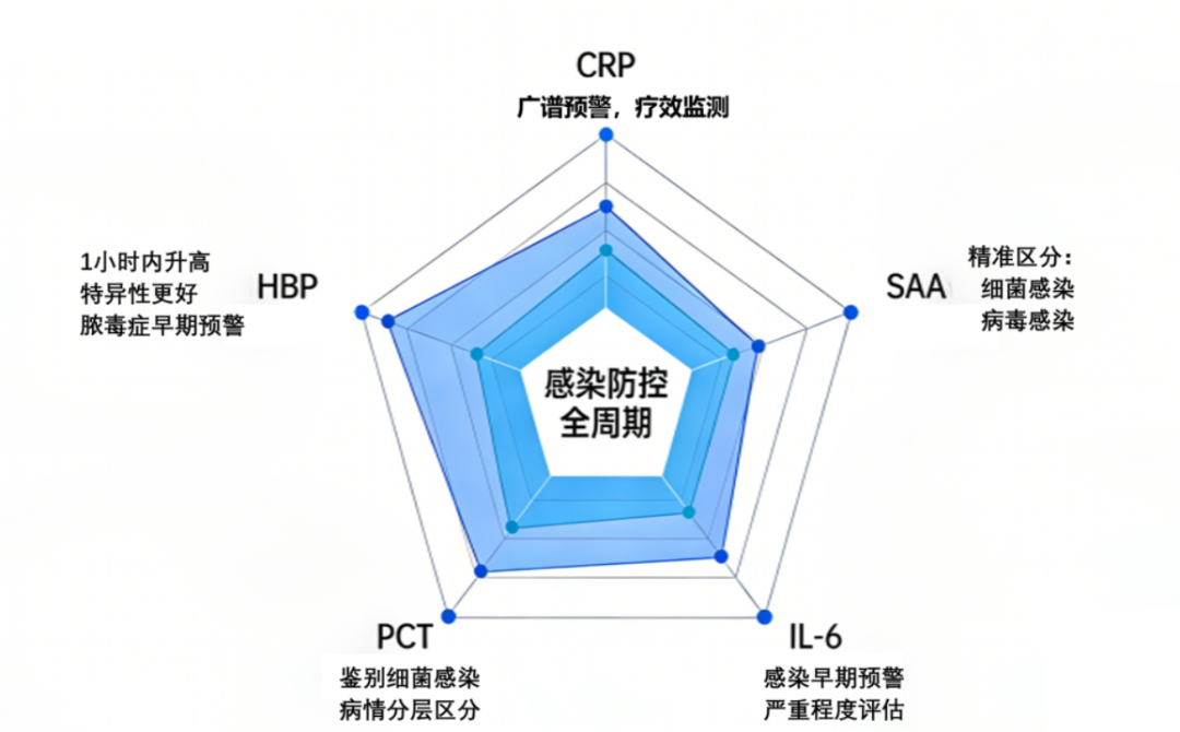 而早期精准识别感染类型、评估炎症程度是降低死亡率的关键。传统感染检测手段存在特异性不足、预警滞后等局限,难以满足临床快速诊断需求。基于化学发光技术的炎症因子五项(CRP、SAA、IL-6、PCT、HBP)检测,凭借“早、准、特”的核心优势,成为感染防控体系的核心支撑。