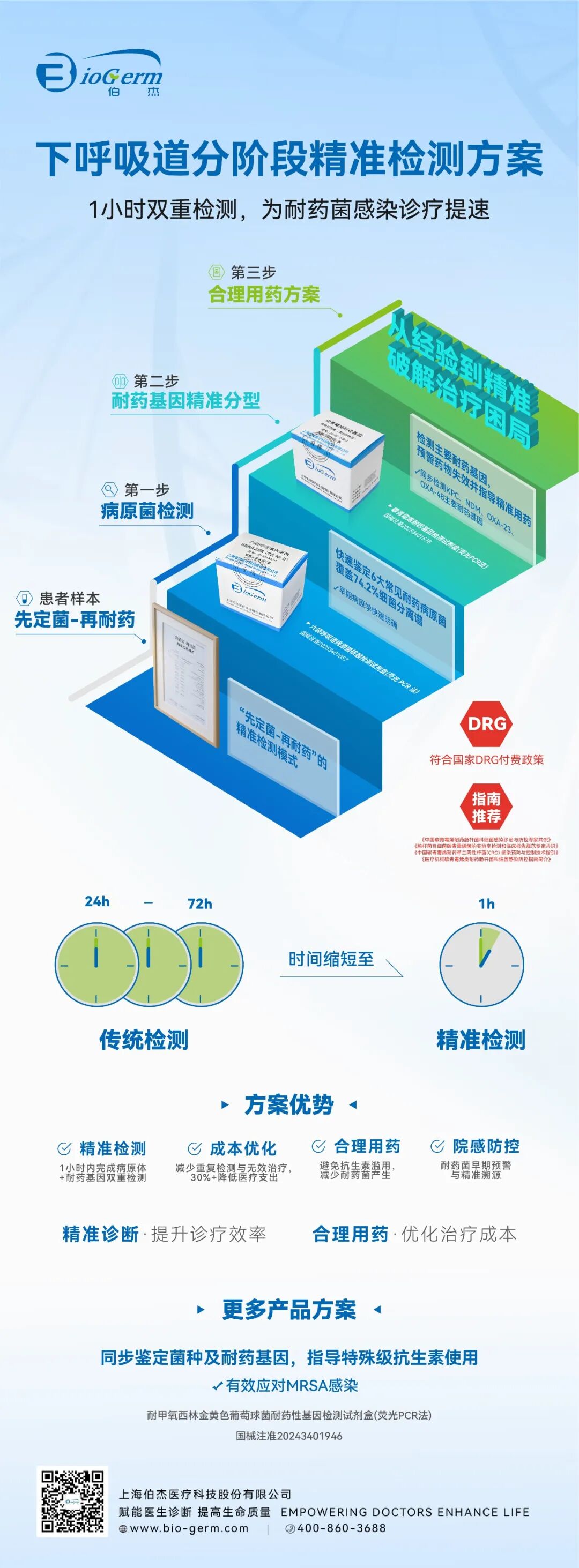 上海伯杰医疗的下呼吸道六项细菌检测试剂,涵盖肺炎链球菌、肺炎克雷伯菌、大肠埃希菌、铜绿假单胞菌、鲍曼不动杆菌及流感嗜血杆菌,另外伯杰医疗自主研发的碳青霉烯耐药核酸检测试剂盒可精准检测KPC、NDM、OXA-23、OXA-48 四类常见基因型,精准契合遏制细菌耐药的临床需求。前者覆盖下呼吸道高发致病菌,后者同步锁定NDM、KPC等耐药基因,实现“病原菌+耐药基因”一小时快速出结果。为患者筛查与明确病因提供高效手段,切断传播链、减少碳青霉烯类药物滥用。这不仅为临床快速筛查、明确病因提供了高效可靠的手段,更有助于合理用药、减少碳青霉烯类药物滥用,为切断耐药菌传播、遏制细菌耐药趋势提供了坚实的技术支撑。