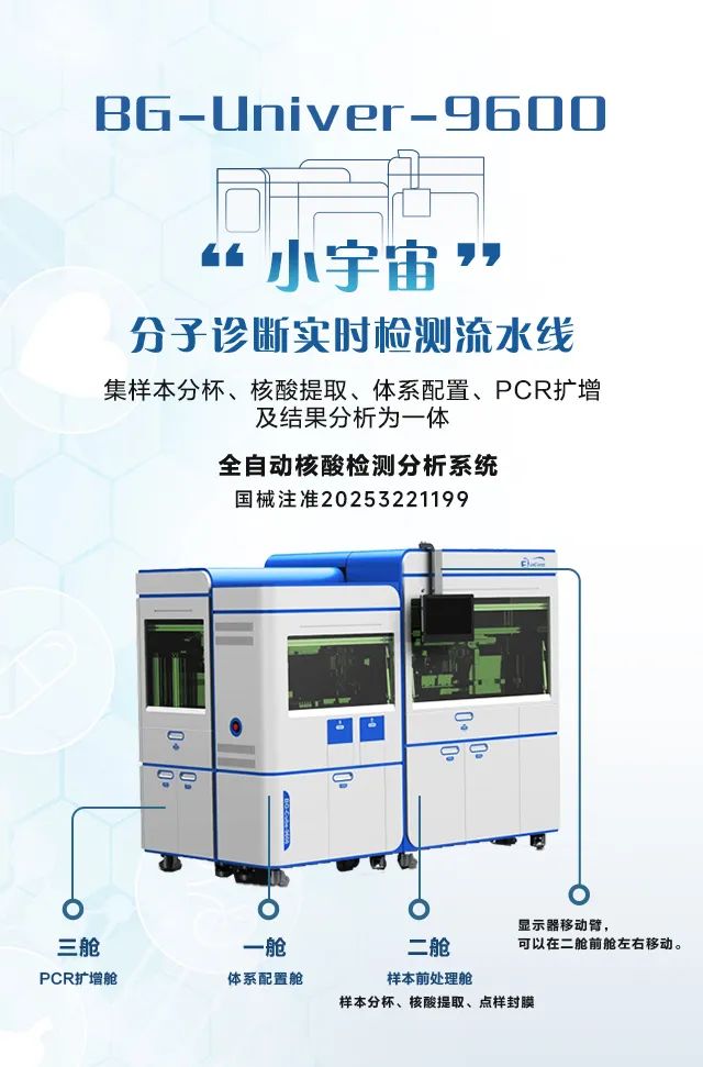 “小宇宙”分子诊断实时检测流水线BG-Univer-9600是对客户需求的深度响应——开放平台设计允许兼容第三方试剂及耗材,既保留了检测灵活性,又通过自动化流水线提升了实验室效率,可广泛适配临床检验科、基层医疗卫生服务中心、疾控中心等多个检测场景。