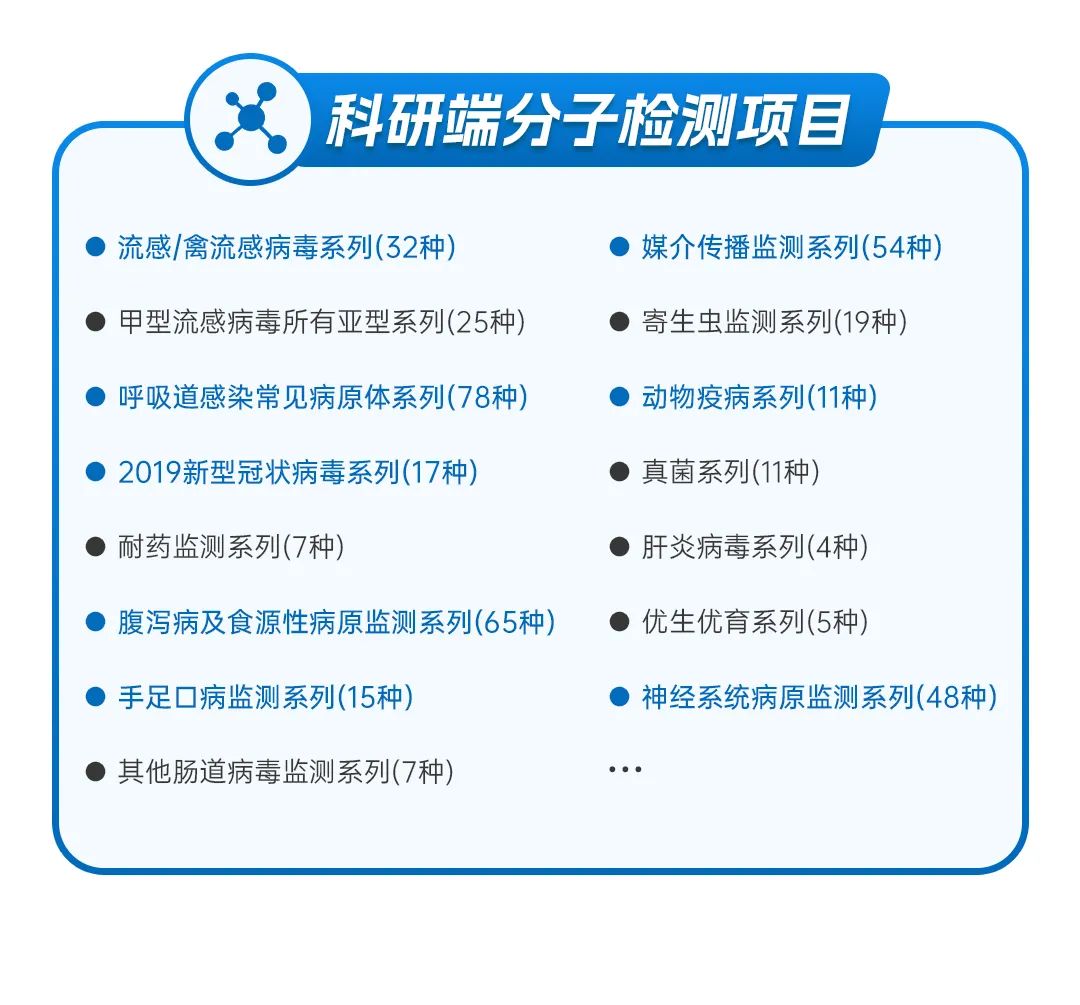 面对高校、科研、疾控、海关等公共卫生监测领域客户需求,“小宇宙”分子诊断实时检测流水线正在逐步适配子公司“青岛伯杰”依托实时荧光PCR技术平台,针对发热伴呼吸道、发热伴腹泻、发热伴出疹、发热伴出血、脑炎脑膜炎等症候群开发的数百款检测试剂产品。