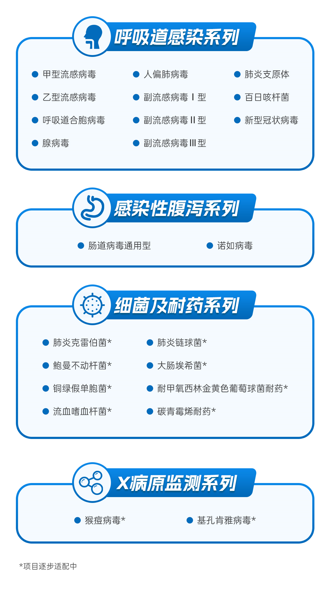 “小宇宙”分子诊断实时检测流水线聚焦分子实验室常见病原自动化核酸检测,可支持20个项目同时上机进行核酸快检检测,同步出报告,包括: