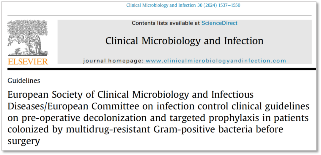 [1] Righi E, et al. European Society of Clinical Microbiology and Infectious Diseases/European Committee on infection control clinical guidelines on pre-operative decolonization and targeted prophylaxis in patients colonized by multidrug-resistant Gram-positive bacteria before surgery. Clin Microbiol Infect. 2024 Dec;30(12):1537-1550.