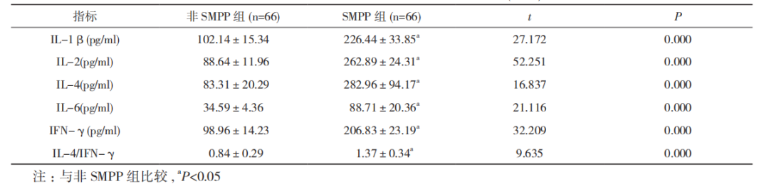 另有研究,重症肺炎支原体组(SMPP)与非重症肺炎支原体组(非SMPP)炎症细胞因子水平比较发现,SMPP组患儿急性期BALF中IL-1β、IL-2、IL-4、IL-6、IFN-γ、IL-4/IFN-γ 均显著高于非SMPP组 , 差异具有统计学意义 (P<0.05)。(表1)