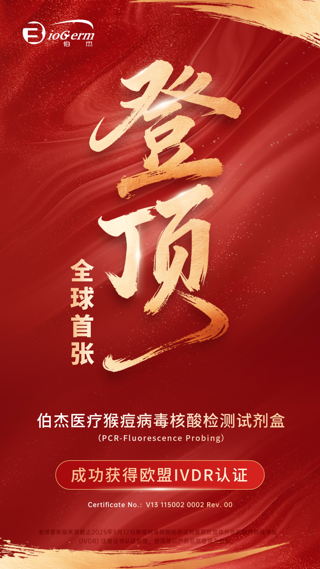 伯杰医疗此次获得的全球首张猴痘检测IVDR证书(Certificate No.:V13 115002 0002 Rev. 00),不仅是对产品卓越性能的肯定,更是中国诊断企业研发实力、质量管理体系和临床验证能力全面达到国际顶尖水平的铁证。