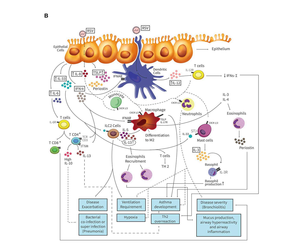 细胞因子检测可为RSV感染的病情分层、疗效检测以及提示预后转归提供了客观依据,尤其在婴幼儿重症 RSV 感染的早期干预和远期风险评估中具有不可替代的价值。
