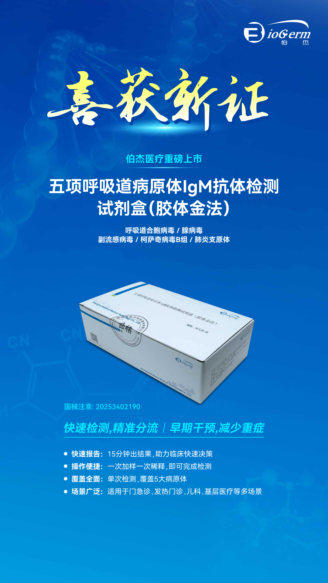 近日,伯杰医疗自主研发的五项呼吸道病原体IgM抗体检测试剂盒通过国家药品监督管理局审核,获批上市。该试剂可用于定性检测人血液样本中的呼吸道病原体抗体, 用于呼吸道感染的辅助诊断。该产品以“一卡五项、一步加样、15分钟快检”为核心特点,直击当前呼吸道感染诊疗痛点,为各级医疗机构提供快速、高效的诊断工具。