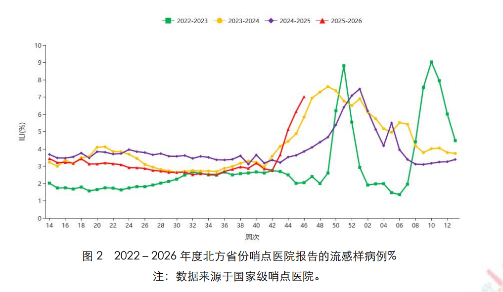 根据中国疾控中心最新发布流感监测周报数据,2025 年第 46 周(2025 年 11 月 10 日-2025 年 11 月 16 日),南北方省份哨点医院报告的ILI%继续上升,均高于过去3年同期水平。