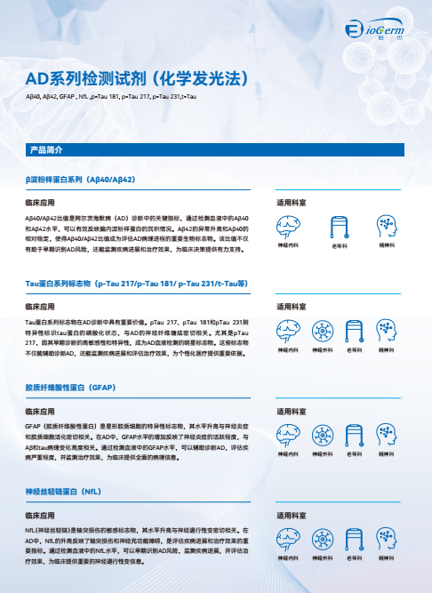 上海伯杰医疗科技股份有限公司针对中国老年痴呆发病持续增长,病人和家属迫切需要有效早期检测手段,依托高灵敏度化学发光技术,自主开发AD系列检测试剂,实现“一滴血”检测AD特异性生物标志物,包括Aβ42/40,pTau217,pTau181,GFAP,NfL等指标,可帮助临床医生基于”A+T+N”诊断框架进行疾病诊断,对病患进行早期筛查,病症分型,干预效果监测等不同临床用途需要。
