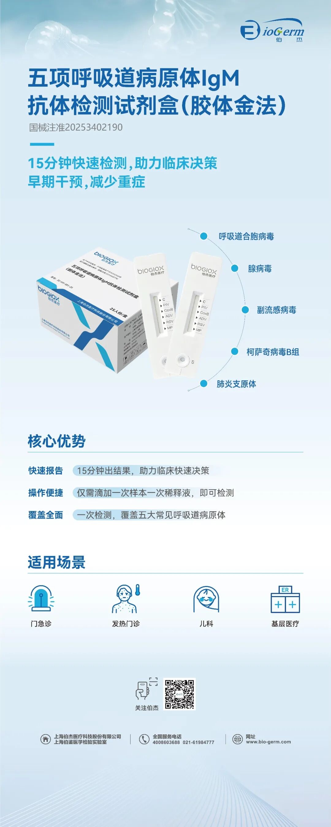 伯杰医疗自主研发的五项呼吸道病原体IgM抗体检测试剂盒可用于定性检测人血液样本中的呼吸道病原体抗体, 用于呼吸道感染的辅助诊断。该产品以“一卡五项、一步加样、15分钟快检”为核心特点,直击当前呼吸道感染诊疗痛点,为各级医疗机构提供快速、高效的诊断工具。