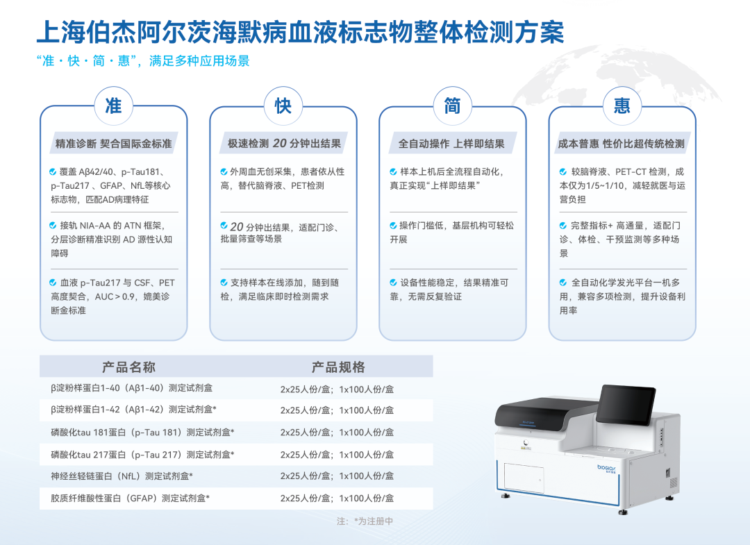 上海伯杰深耕神经退行性疾病诊断领域,从核心原料破局,重磅推出阿尔茨海默病血液检测系列产品,以 “准、快、简、惠” 四大核心优势,破解 AD 早诊临床痛点,适配多场景应用需求,助力AD诊疗在基层的推广应用,为《应对老年期痴呆国家行动计划(2024-2030年)》提供可靠技术方案。